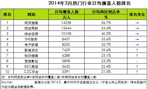 根據(jù)艾瑞推出的網(wǎng)民連續(xù)用戶行為研究系統(tǒng)最新數(shù)據(jù)顯示, 2014年3月,網(wǎng)頁搜索日均覆蓋人數(shù)達(dá)1.4億人,網(wǎng)民到達(dá)率為56.7%,位居第一;網(wǎng)站導(dǎo)航日均覆蓋人數(shù)達(dá)1.4億人,網(wǎng)民到達(dá)率為54.4%,位居第二;綜合視頻日均覆蓋人數(shù)達(dá)1億人,網(wǎng)民到達(dá)率為40.3%,位居第三。