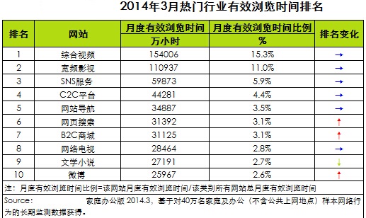 根據(jù)最新監(jiān)測數(shù)據(jù)顯示,2014年3月,綜合視頻有效瀏覽時(shí)間達(dá)15.4億小時(shí),仍為網(wǎng)民有效瀏覽時(shí)間最高的服務(wù);寬頻影視有效瀏覽時(shí)間達(dá)11.1億小時(shí),位居第二;SNS服務(wù)有效瀏覽時(shí)間達(dá)6億小時(shí),位居第三,三者合計(jì)占總有效瀏覽時(shí)間的32.3%。