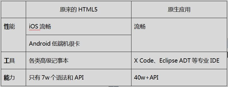 因?yàn)楦鞣N原因,Cordova 的定位最終沒有成為瀏覽器的強(qiáng)化,而走向了混合式開發(fā)。基于當(dāng)時(shí)的背景,他們認(rèn)為原生是不可替代的,“原生 +HTML5”的混合模式更有意義。所以現(xiàn)在 Cordova 的使用往往是“原生工程師 +HTML5 工程師”一起協(xié)作完成 App。