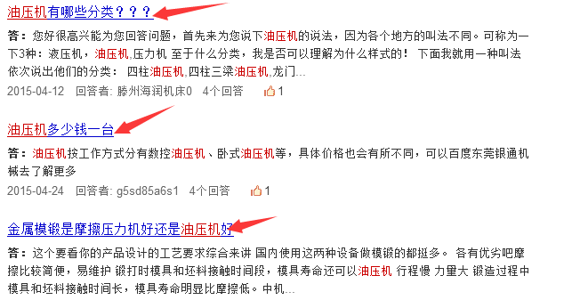像百度知道、搜索問問、天涯問答,或者相關(guān)的行業(yè)論壇,只要搜索一下關(guān)鍵詞,就可以找到很多用戶提問的問題,而這些問題里面出現(xiàn)的關(guān)鍵詞很大程度都是用戶需求的。比如下圖中,我們在百度知道搜索“油壓機”也可以挖掘到大量的關(guān)鍵詞。