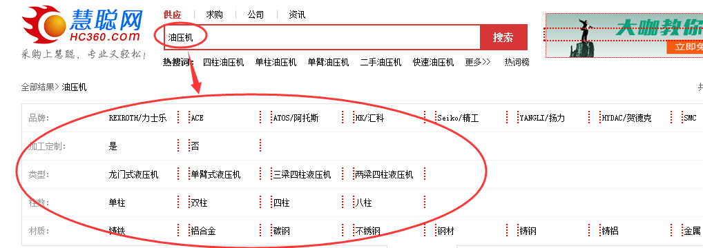 很多大型網(wǎng)站基本都對行業(yè)進行了屬性分類,這些屬性跟關(guān)鍵詞組合起來也是用戶可能搜索的關(guān)鍵詞。因此,通過采集同行網(wǎng)站的屬性分類模塊,也是一個挖掘途徑。比如慧聰網(wǎng)上面對油壓機的屬性分類模塊,就可以采集到很多關(guān)鍵詞(如下圖所示)