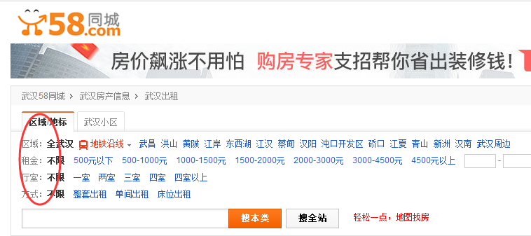我們就以武漢58同城的房屋出租作為案例進行講解。如下圖所示,武漢58同城將武漢房屋出租的用戶需求分為了“區(qū)域”、“租金”、“廳室”、“方式”4種屬性