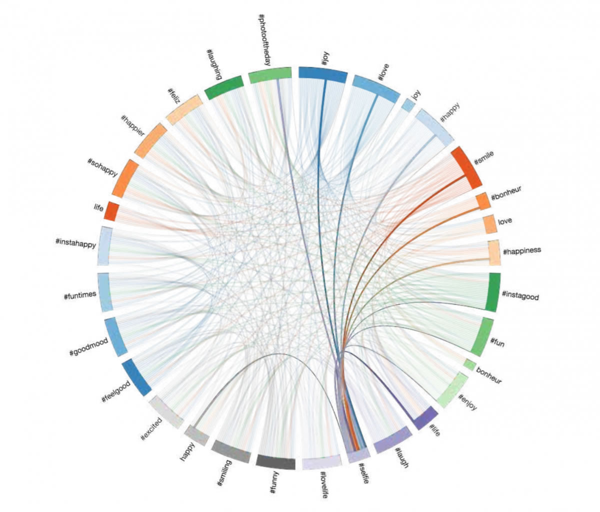 關(guān)鍵詞關(guān)系圖,其中多個(gè)與“愉悅感”相關(guān)的詞匯(如”微笑“”快樂“)都聚集至“selfie”