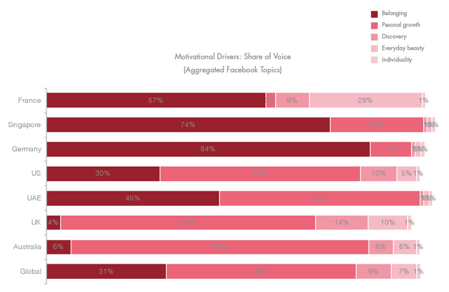 各地區(qū)話題占比一覽,由深至淺分別是歸屬感、個(gè)人成長(zhǎng)、探索發(fā)現(xiàn)、美容健體、個(gè)性與獨(dú)立,從上至下是法國(guó)、新加坡、德國(guó)、美國(guó)、阿聯(lián)酋、英國(guó)、澳大利亞及全球