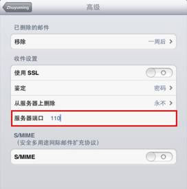 注:如驗證無法通過,可以打開“設置”中“郵箱、通訊錄、日歷”選項,點擊已建立的賬戶,點擊“高級”核對一下ssl狀態和端口。“使用ssl”需為關閉狀態,如使用pop服務,端口號為110;使用Imap服務,端口號為143,如下圖: