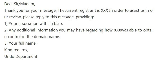 這一過程需要向原域名注冊商說明情況,并且提供域名所有人身份證明及其他一切能證明域名所有者的材料,最好能提供如域名注冊郵件、續費記錄、域名歷史 whois記錄、網站程序和歷史頁面截圖等在內的相關證據。